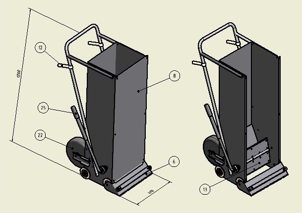 Die Maschine von oben mit Kleber befüllen. Bitte vorher beachten das die Verschlussklappe (Pos. 13) geschlossen ist. Die Maschine in Position fahren, die Verschlussklappe (Pos. 13) mit Hilfe des Teleskopgriffs (Pos. 25) öffnen. Die Maschine über die Handgriffe (Pos. 12) ziehen. Der Kleber wird mit dem Zahnspachtel (Pos. 6) auf den Boden verstrichen. Der Zahnspachtel ist federnd gelagert und hat somit immer Bodenkontakt. Durch Kippen der Maschine kommen die Luftbefüllten Räder (Pos.22) zum Einsatz. Nach Beendigung des Auftrags lässt sich die Maschine leicht reinigen. Der Deckel (Pos. 8) kann, durch das entfernen der Rändelschrauben, abgenommen werden.
